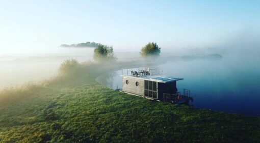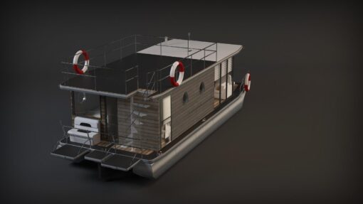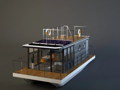 Apartboat XL floats on the water thanks to two (catamaran) or three (trimaran) floats (displacement hull). We use four different types of floats: steel, aluminium, concrete or polyethene depending on the customer’s needs. Thanks to the use of innovative technologies such as heating system, solar panel system, water purification or desalination system, and even a sewage treatment system makes this floating house completely independent of external media. The sailing category D and the help of two independent, high thrust outboards, control panel, control system and thruster mentioned above allow you to sail with Apart XL on rivers, canals, lakes and coastal waters.